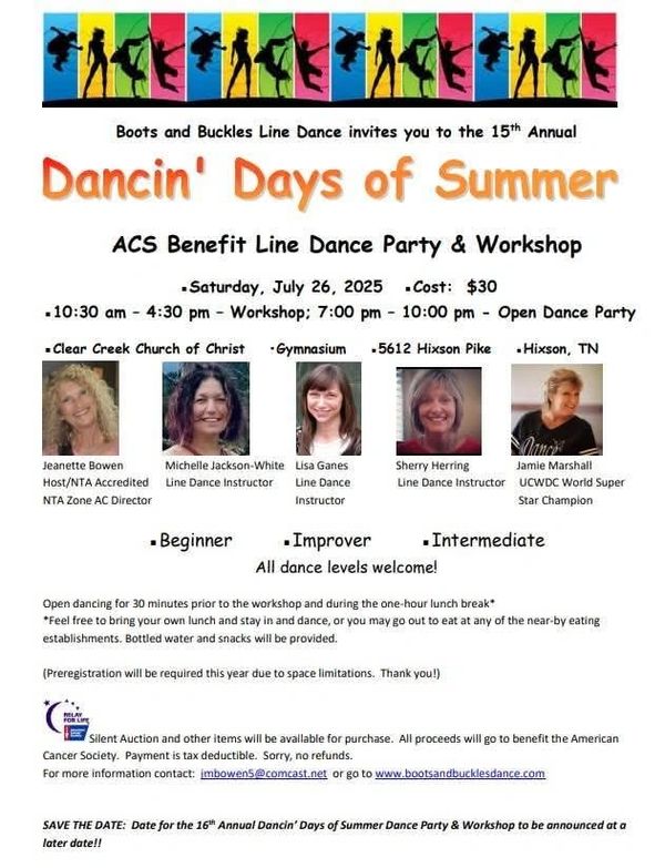 Please come join us at our 15th annual Dancin' Days of Summer Line Dance Workshop! Proceeds from this dance go to benefit the American Cancer Society.